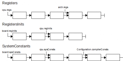 Registers are defined in the architecture and in the CPU. Initial values for certain registers can be defined for a CPU and a board. System constants can be defined for a board, a CPU and as compiler constants. All these items are stored as linked lists (see figure) for efficient searching.