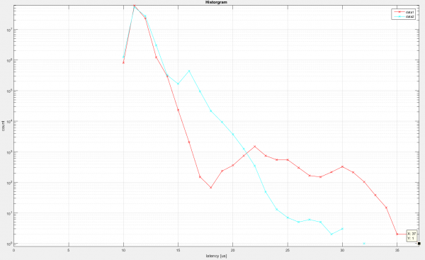 Um die Performance des iMX6 zu messen wurde der Cyclic-Test 24h laufen gelassen. Mit dd wurde künstliche Last (100%) für die beiden Kerne erzeugt (siehe künstliche Last).